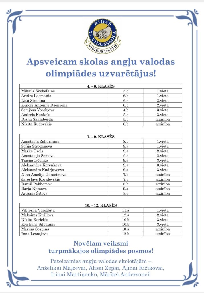Izglītība ir viens no svarīgākajiem dzīves posmiem, kas veido mūsu nākotni, personību un spēju sasniegt sapņus. 31. oktobrī mūsu skolas aktu zālē notika svinīgs pasākums — tika godināti angļu valodas skolas olimpiādes uzvarētāji un dalībnieki. Svinīgajā gaisotnē skanēja apsveikuma vārdi, valdīja lepnums un prieks par skolēnu veikumu, un katrs saņēma sirsnīgu atbalstu un uzmundrinājumu. Šis brīdis apliecināja, ka mērķtiecība, neatlaidība un zinātkāre nes rezultātus — un mūsu skolēni to pierāda ar savu darbu un sasniegumiem. Mūsu skolotāji ik dienu iedvesmo, atbalsta un motivē skolēnus meklēt jaunus apvāršņus un tiekties uz izcilību.