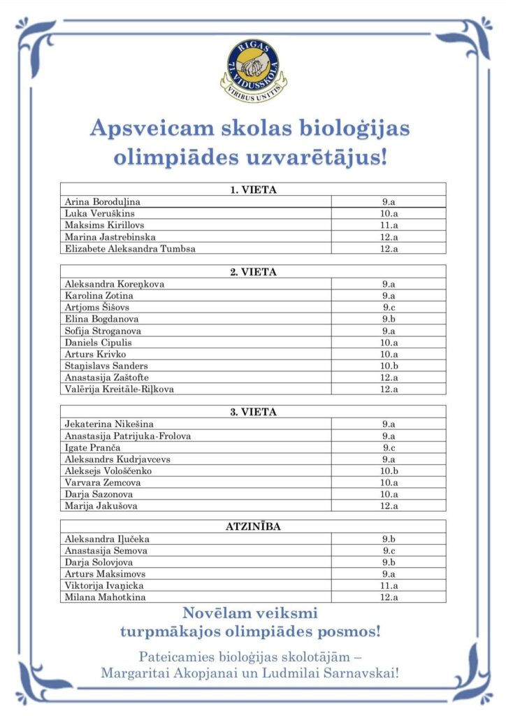 Mūsu skolas jaunie pētnieki parādījuši izcilas zināšanas bioloģijā un guvuši lieliskus rezultātus skolas olimpiādē! Lepojamies ar katra skolēna neatlaidību, interesi un vēlmi izzināt vairāk.